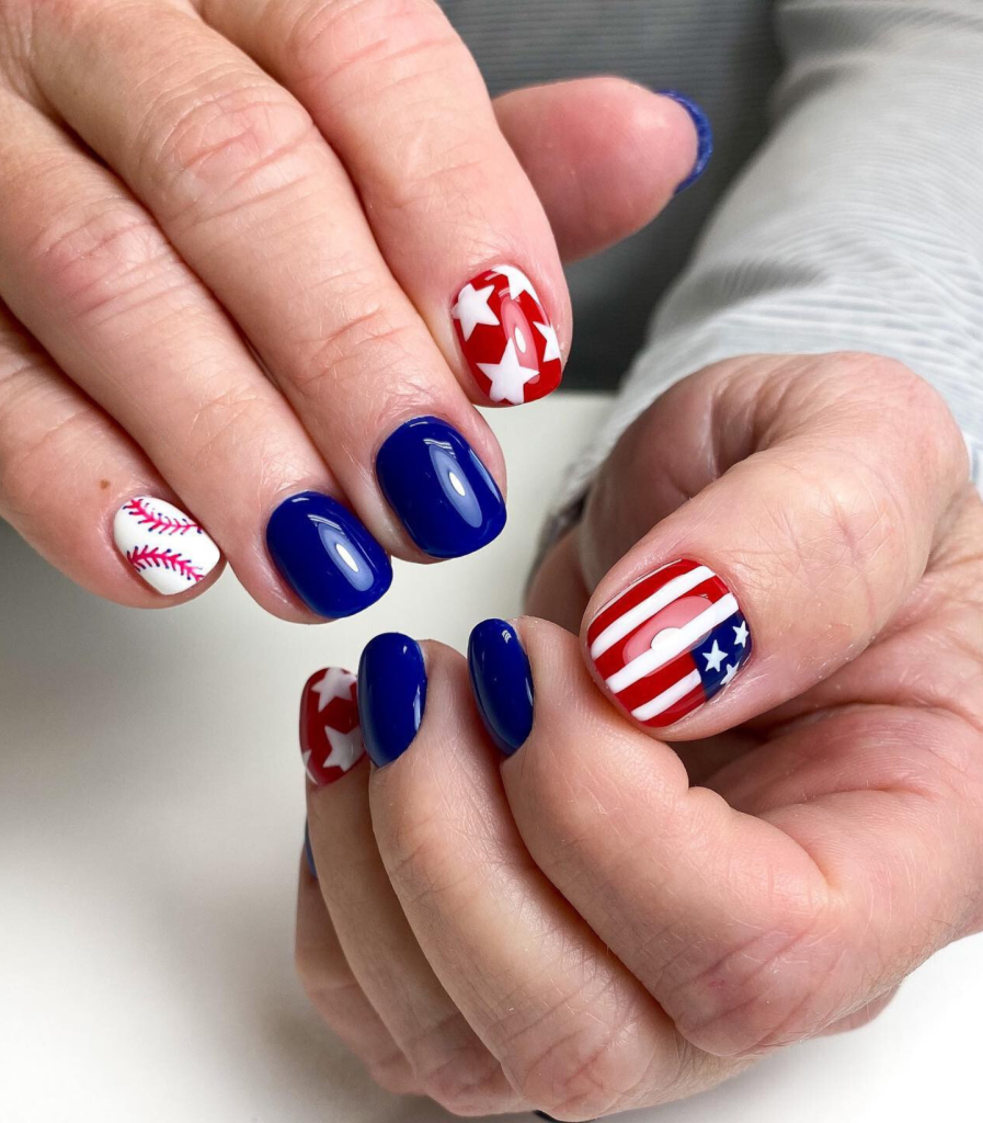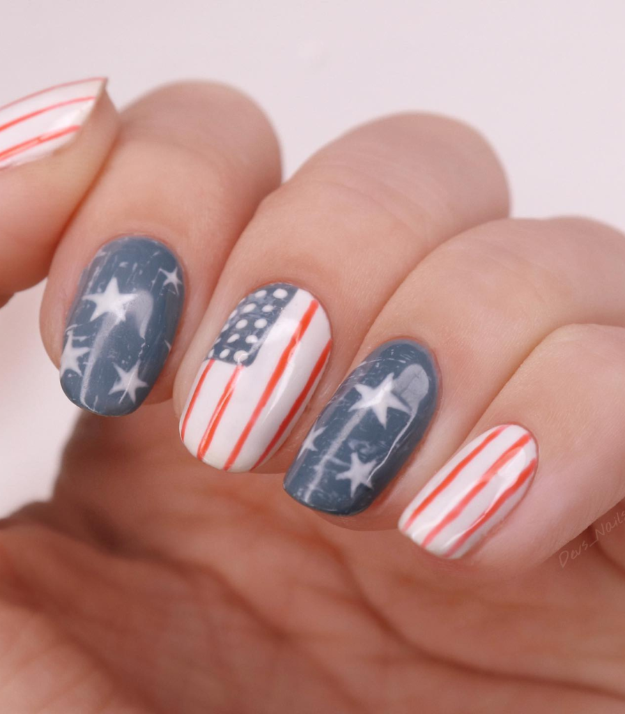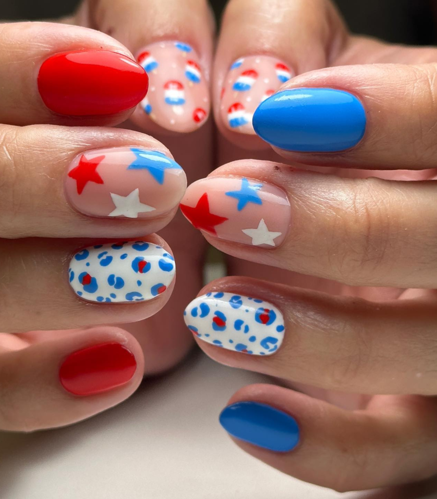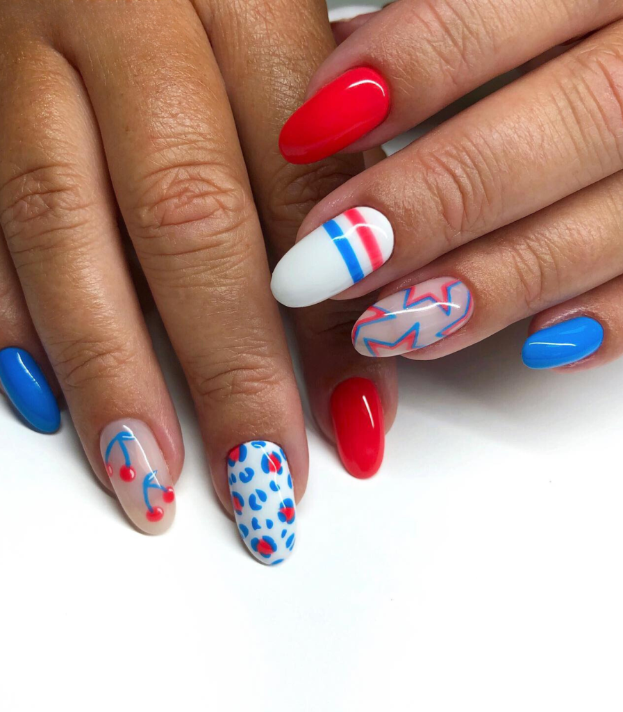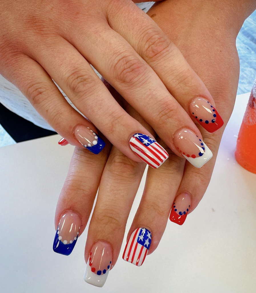 If you are looking for a playful twist on the patriotic palette, try these polka-dotted nails. The round nails are a canvas for red and blue dots over a white base, thus showing the playful spirit of summer fairs and picnics.