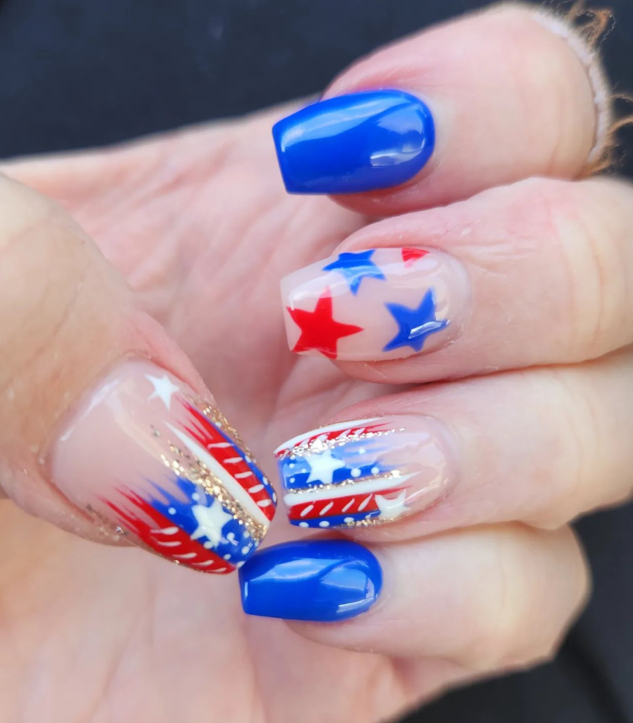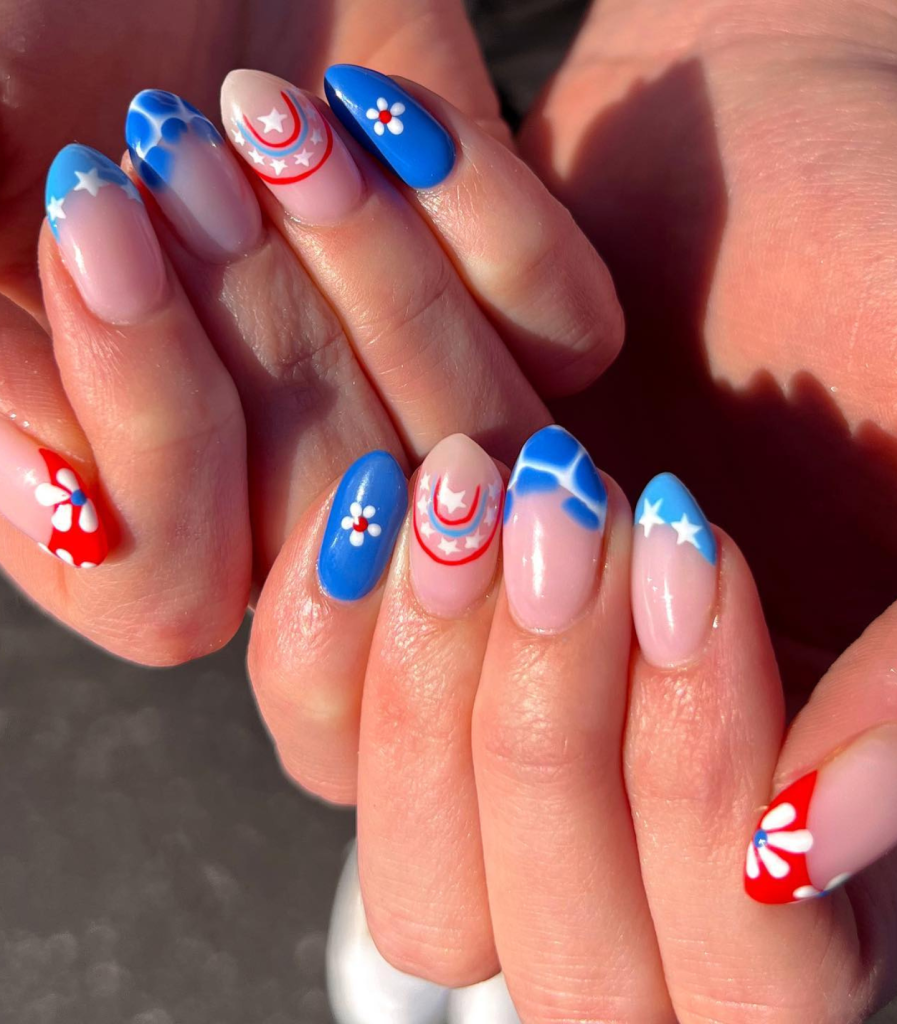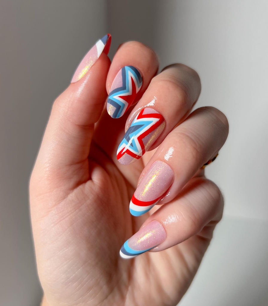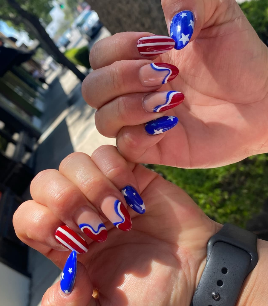 Emulating the ocean’s undulation and the flag’s wave with these gel nails that have an abstract design is really cool. The motion-like swirls of red and blue, which are not the usual ones, say that the July 4th theme can be far out and that nail art can be both thematic and avant-garde.