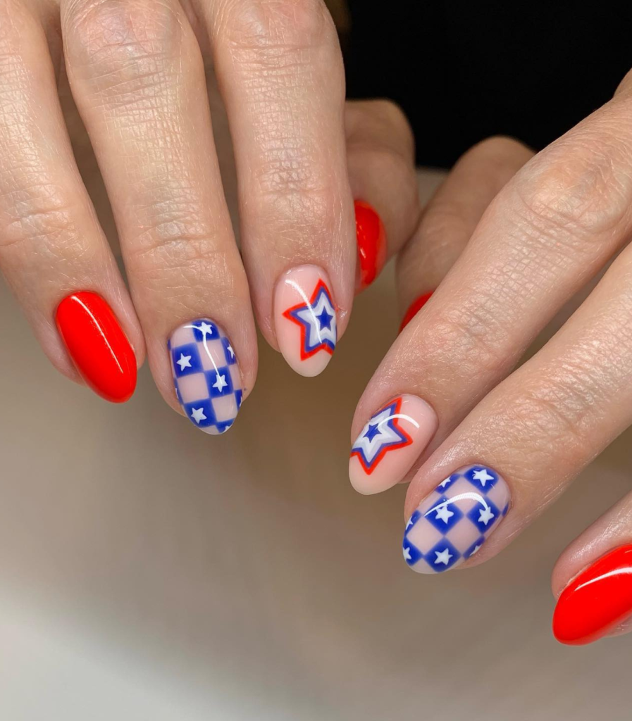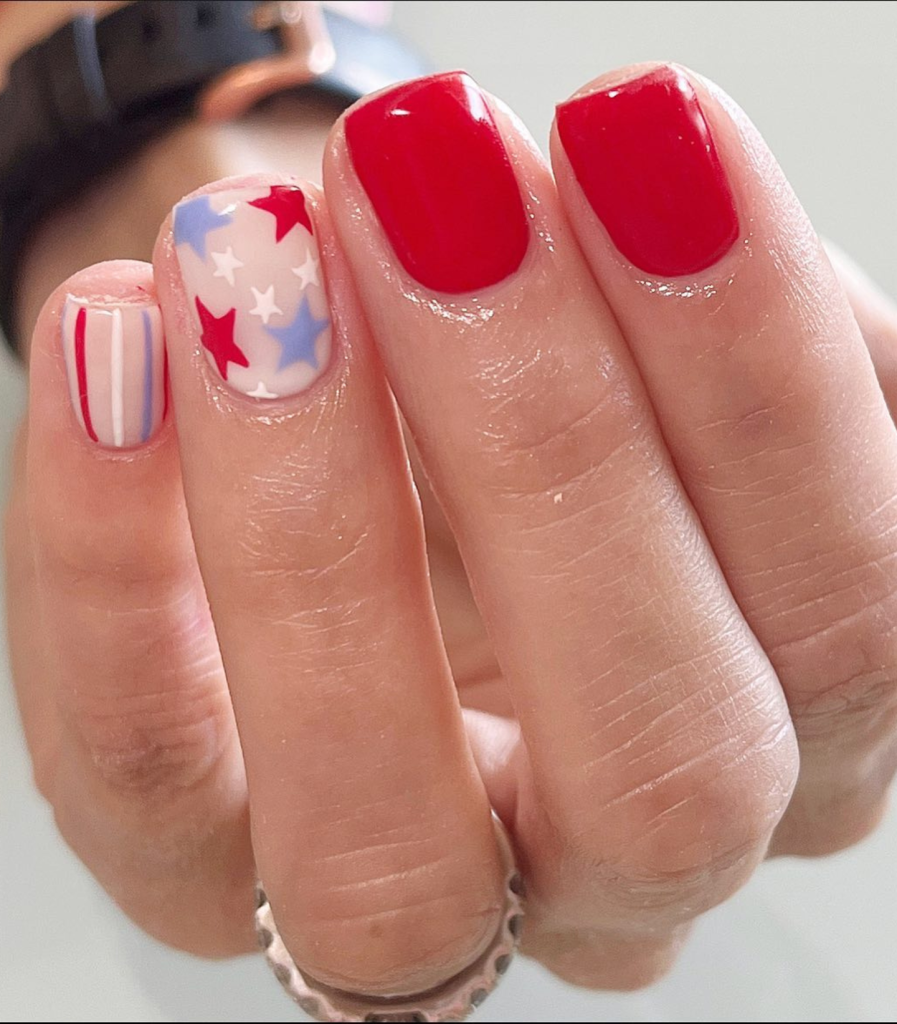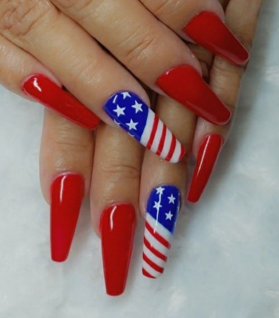 Bright red nails are a go-to that never becomes outdated. But, placing a nail with the American flag on this set of nails makes it a breathtaking statement of the Independence Day. This acrylic set, with its glossy red and patterned nails mix, highlights the cute yet bold nail art style.