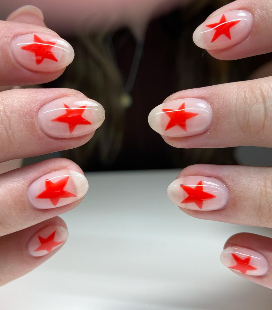 The beauty of elegance lies in sheer nails adorned with scattered red stars. These are natural nails that with just a little bit of design are perfect to wear on holidays and these stars are very cute and idyllic.
