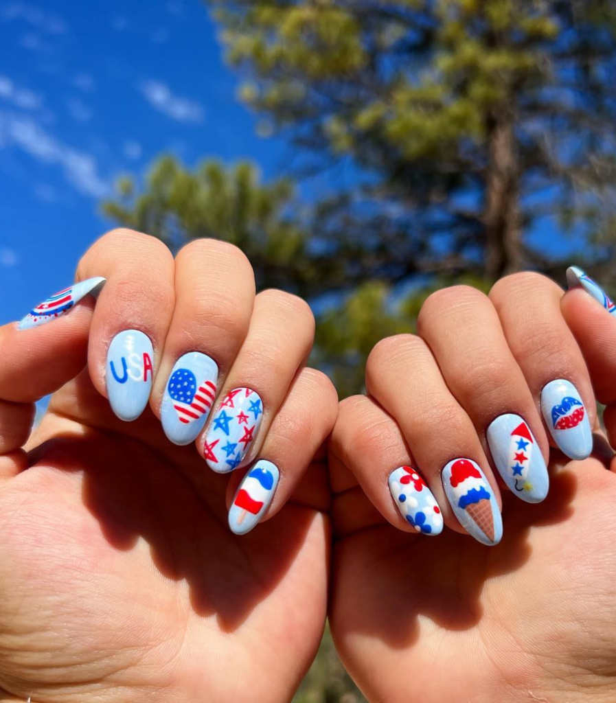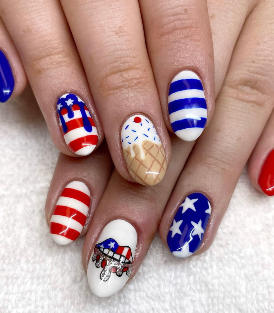 This amusing design showcases nails that taste of cooling summer ice creams and bright clear skies. The combination of blue and red stripes and the suitability of ice cream cone designs for a summertime party will be the main talk of any July 4th gathering.