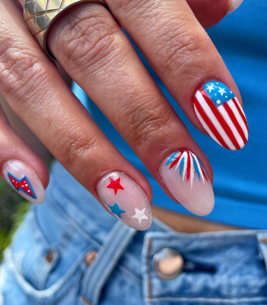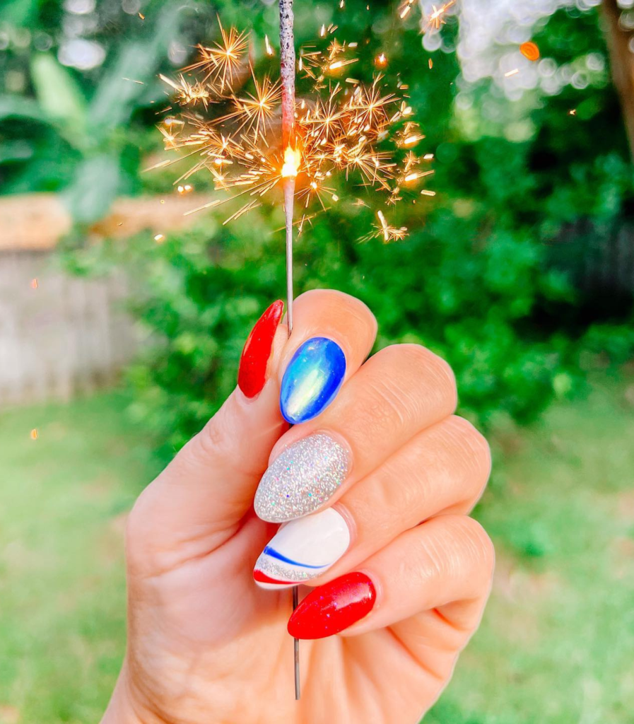 What is July 4th without sparklers? The idea of these nails, as they are with bright sparkly additions, is really looking like a firework show on a summer night. Of course, the red, blue, and silver oval nail combination is beautiful and will glimmer in the light of the firework.