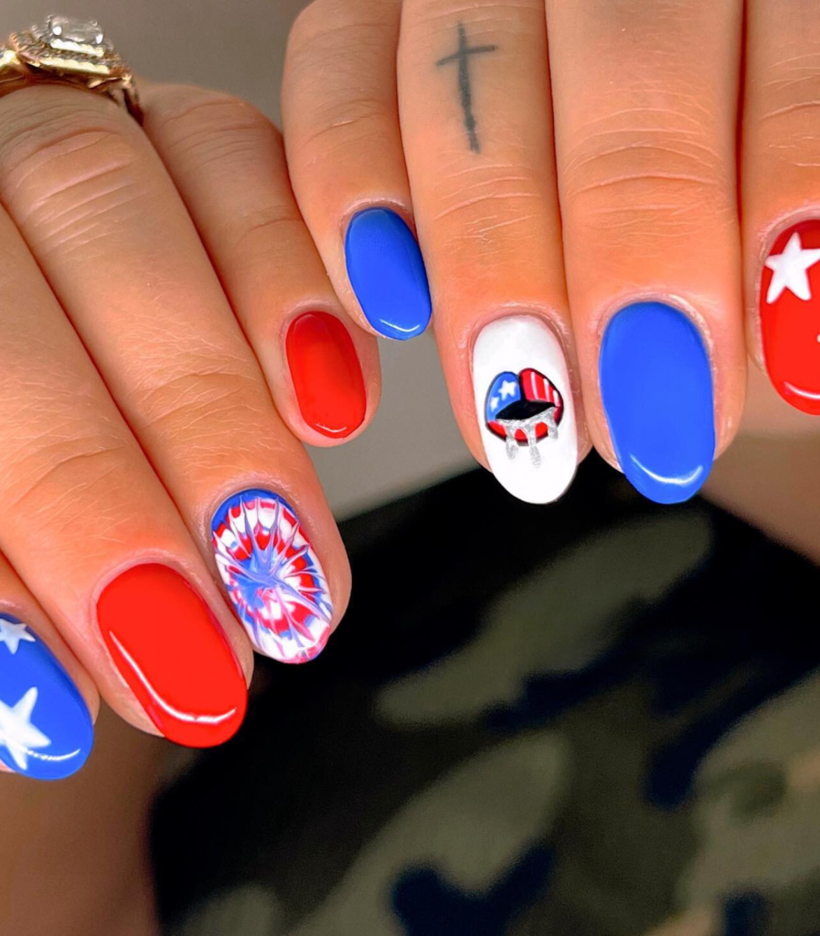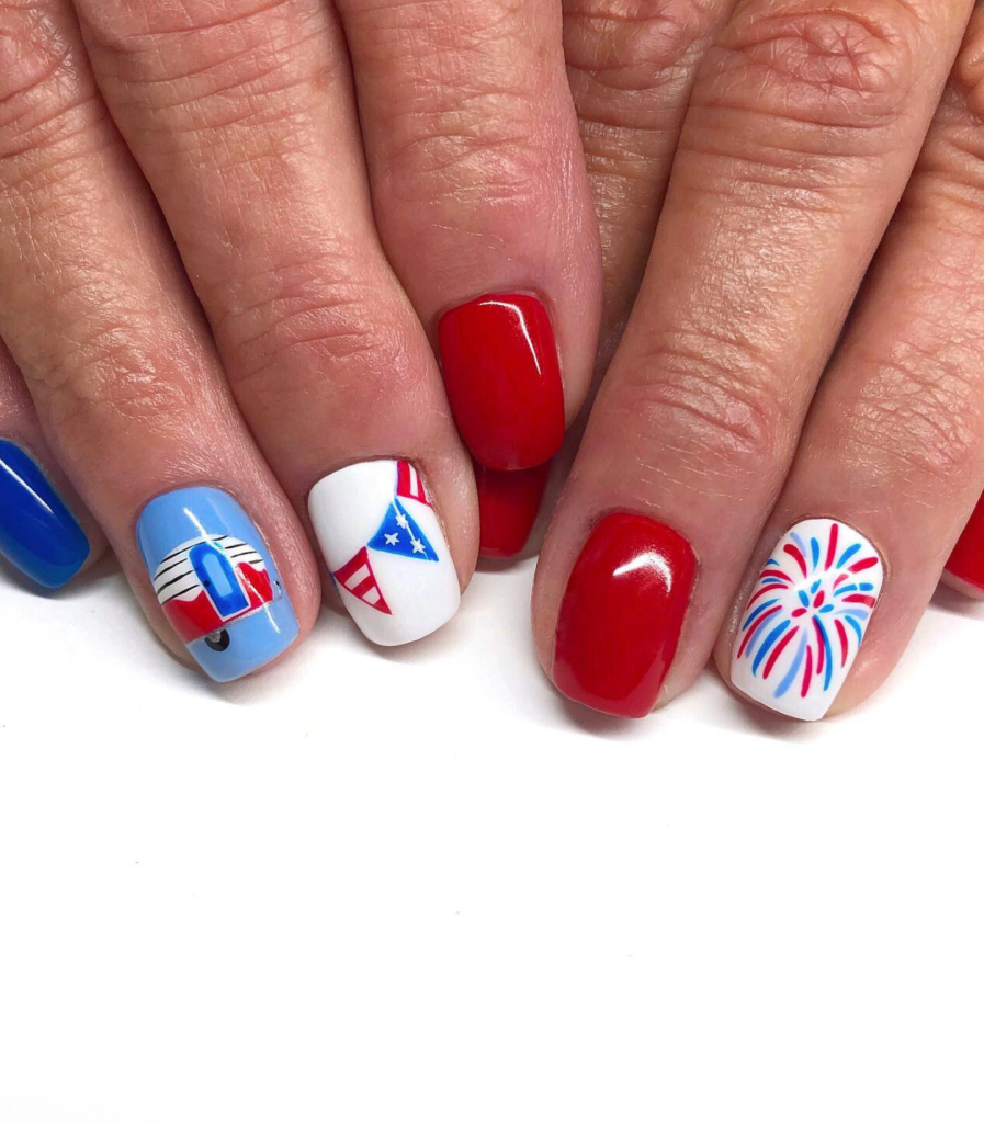 An explosion of creativity was created by using a firework design on one of the nails and the elements of the American flag on the remaining nails. Mixing nails with a firework design and others associated with the American flag, this style is figuratively an explosion of creativity.