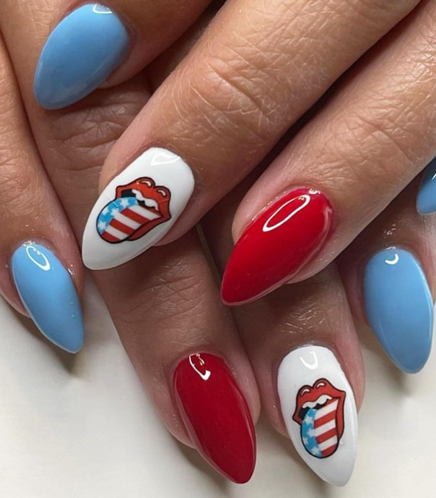 A classic red manicure can be the best way to express happiness for 4th of July. These nails made of acrylic and having a stiletto shape are embodying the bright red of summer’s sunsets. The mirror-like surface seems even more alluring, making them suitable not only for the summer BBQ but also for the evening’s doing of parties.