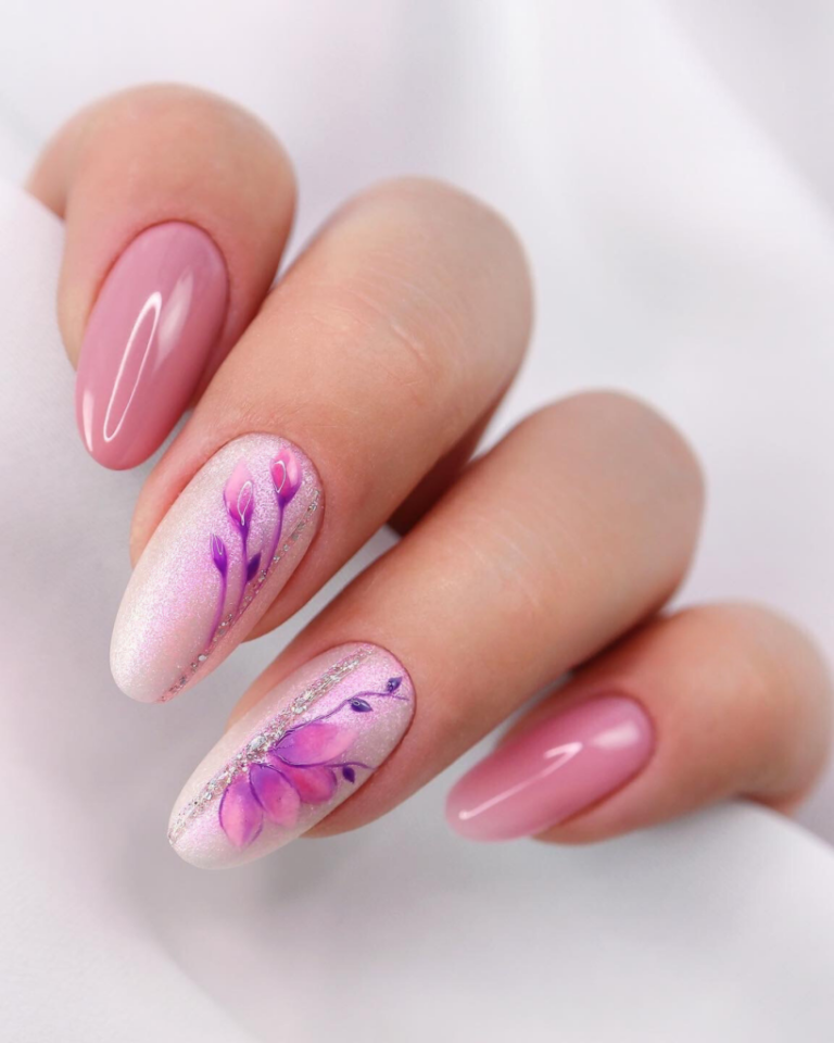 These nails merge their cotton candy base with sheer glam to show their suitability for the term of understated elegance. Even though they are just basic, the accent nails have the charm of the iridescent glitter to them. The glitter here resembles a very light snow or the surface of a very still sea, and, in addition, gives a little fun to a typical nail design. The layout is a perfect accompaniment to a winter retreat where you stay warm or for a beach holiday that is where you spell the dress with no effort.