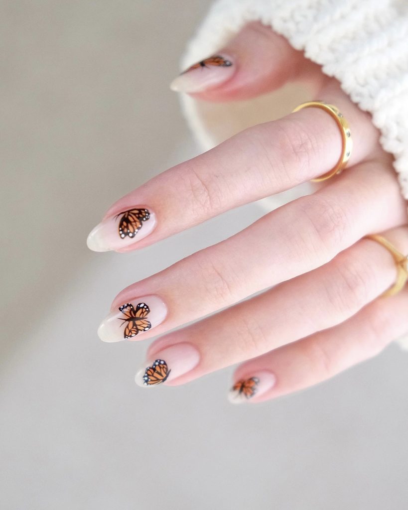 Introducing to the party are nails that reflect the very spirit of a tropical vacation. These almond-shaped nails exhibit an almost otherworldly delicacy with butterfly stickers in the hues of orange and black, which strongly reminds you of a summer butterfly garden. Just like the beach excursion, the light base allows the detailed patterns to be the highlight, thus presenting a cute and playful element to your vacation aesthetics.