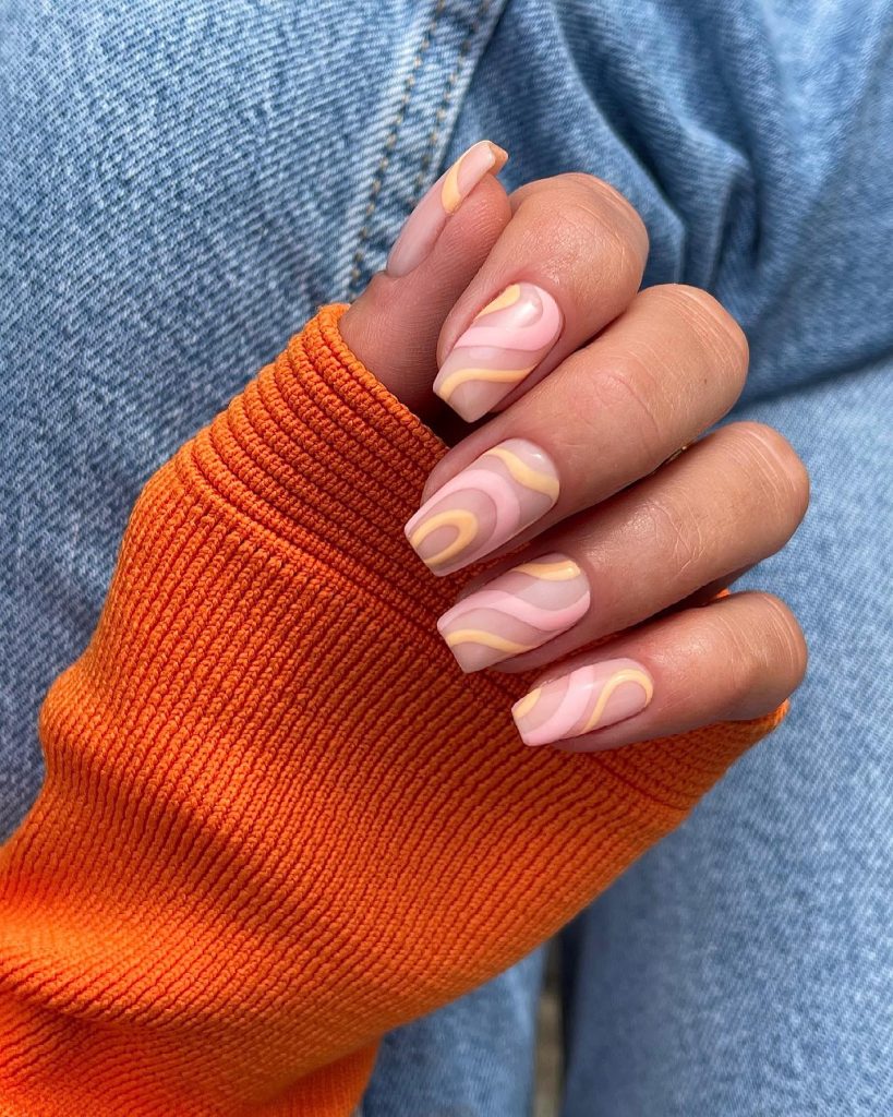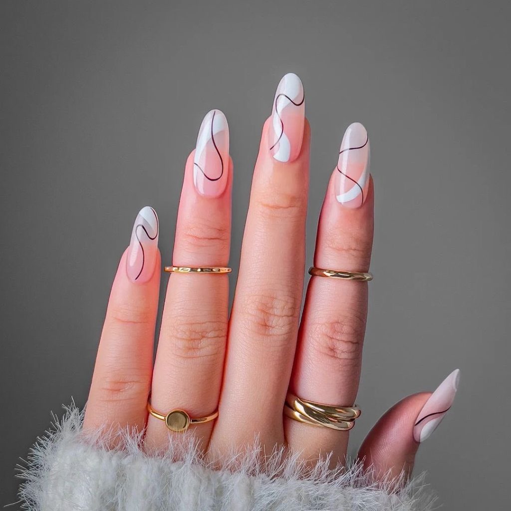 The ocean’s gentle waves inspired this design of these almond nails, which are characterized by an abstract pattern that marries pink and white harmoniously. The whorls lend a feeling of a dynamic motion that suits the lady who enjoys her stay in a new place as much by relaxation as by adventures.