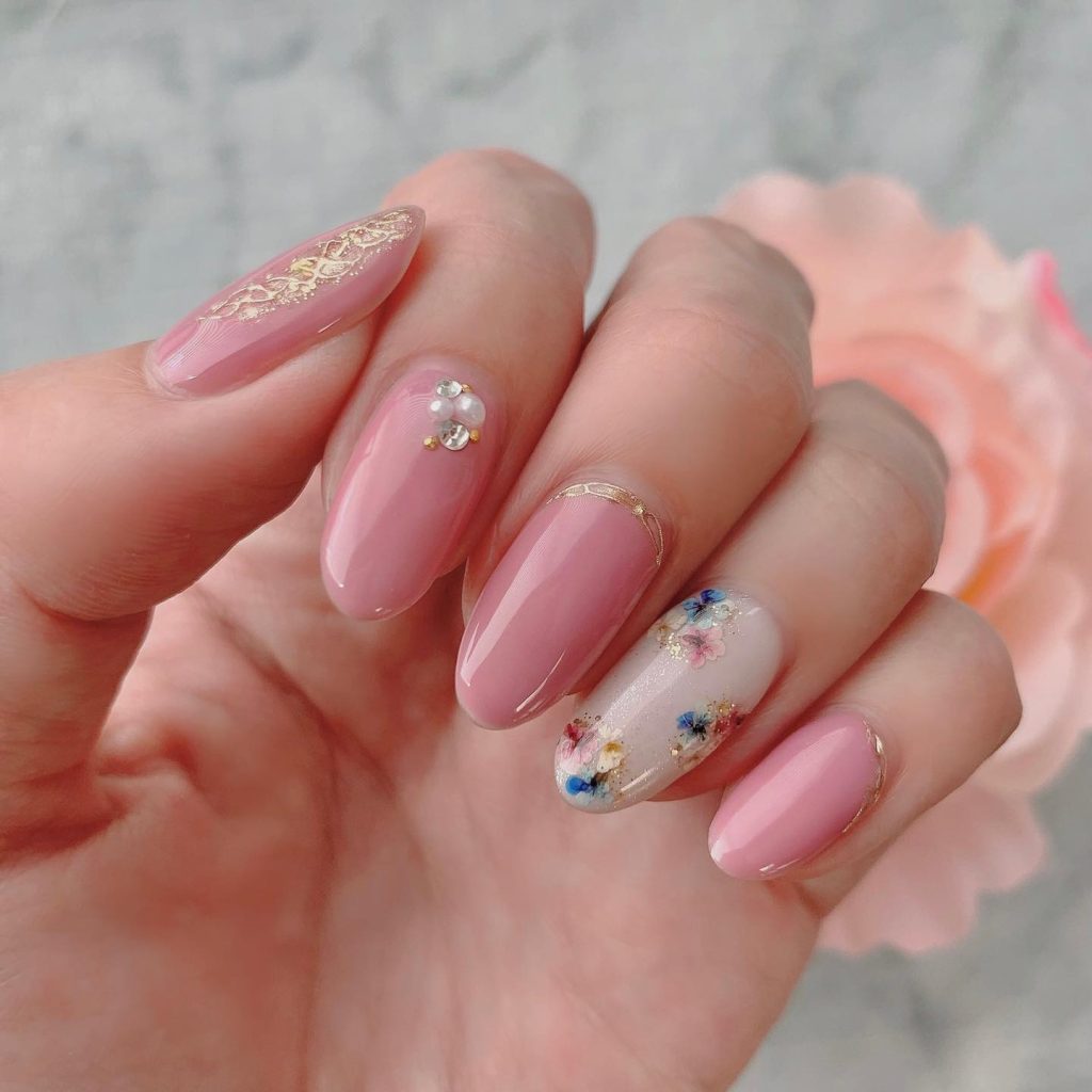 The soft pink nail with floral patterns and gold foil accents is indeed a super cute style to herald spring. These nails are the best example of art, as they depict every single nail full of flowers and the heat of the summer, perfectly for the outdoor events like garden parties and weddings.