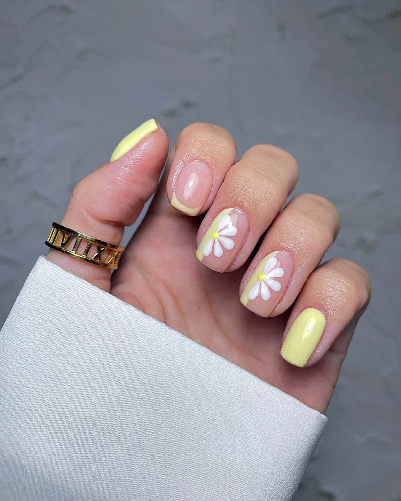 Yellow and pink make for a clear, bright combination on these nails, each of which is adorned with a cute daisy. They’re a positive option that cleverly sums up the essence of a sunny summer day, which can be worn for a day in the city or a picnic in the park.