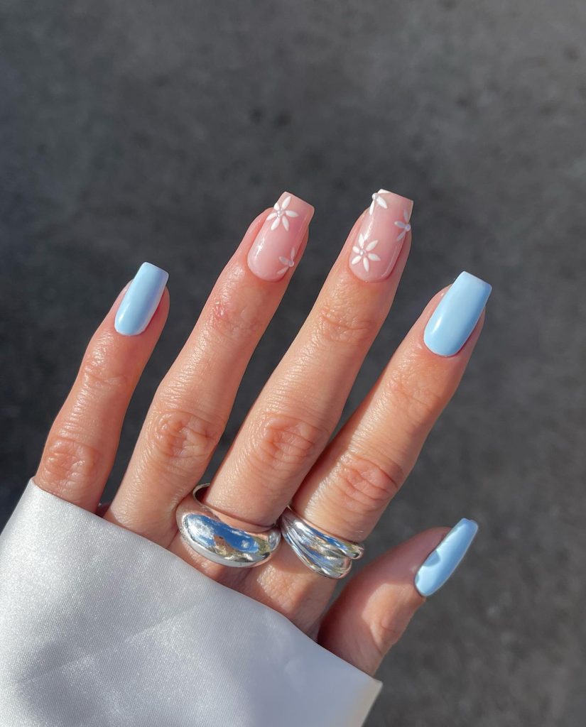 Marble is not only a stone for sculptures and tables; it is a trendy nail material as well. These nails are decorated with an elegant combination of pink and white marble and a single daisy that gives a hint of spring. Daisies are very beautiful and pretty flowers that are mainly used for decoration During a garden party or a premium brunch, this nail design is one of a kind.