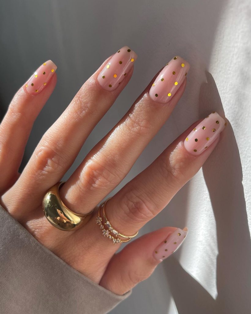 These nails are the perfect mix of simplicity and playfulness. The pink base is embellished with gold dots that create a light, sweet, and luxurious vibe. Their versatility allows the nails to shift from a summer brunch to a night out in the city.