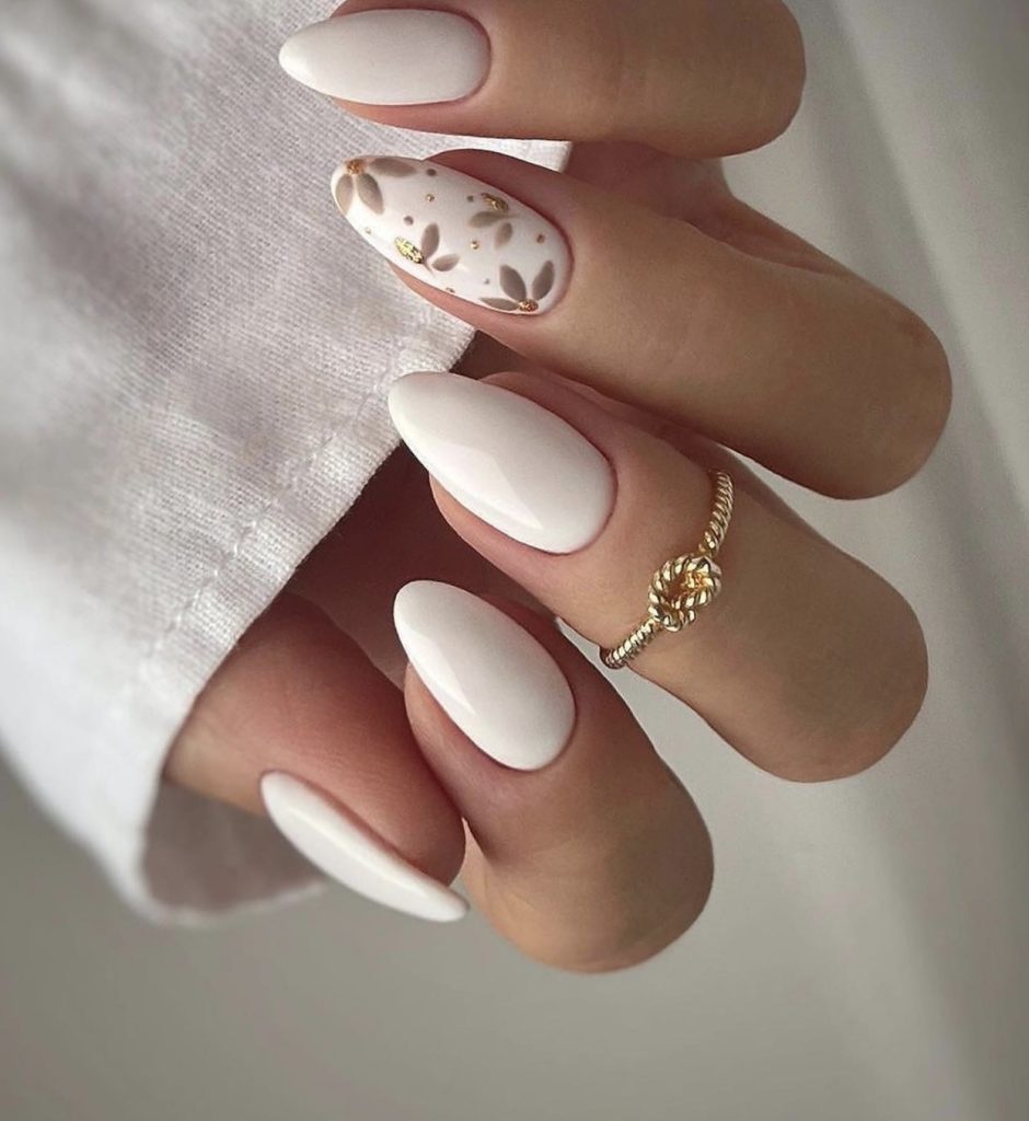 These nails are the quintessence of spring flowers and summer glamour for the woman is fond of elegance. Bejeweled with golden floral accents and tiny, shiny embellishments, these nails radiate luxury. The almond shape has a classic, feminine look, while the white flowers adding a fresh and bright contrast become the perfect accessories to any high-end resort wear.