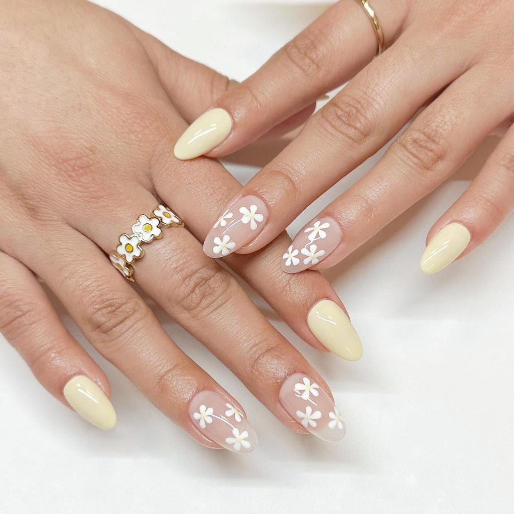 If you are dreaming of summer, then these delightful nails are for you. Muted yellow and white daisies are the style. The match is adorable and significantly summer, introducing a different perspective on vacation nails. Their light and airy feel will easily go with almost all your outfits.