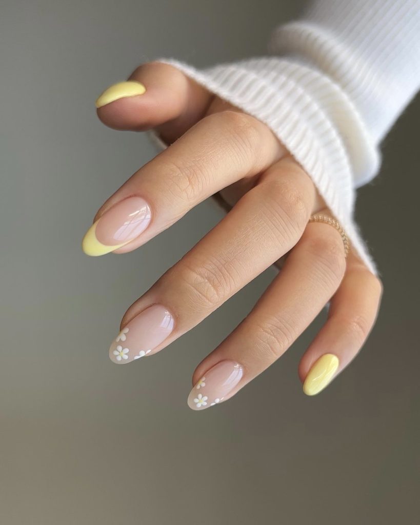 Combining the youthfulness of spring with the fun of summer, these nails are designed with a soft pink base and bright neon yellow tips. Small and fine flowers add a nice feature, which is a good option for a sunshade picnic or a tropical evening party. The almond shape keeps the sophistication, which is why these nails are an excellent choice for the ones who love fun.